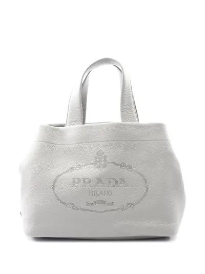 leather body with front perforated logo detail flat straps open top with side snap closures interior zip pocket gray This item has no inclusions. Condition: EXCELLENT. This previously owned item is in near-perfect condition with no signs of damage or use. Due to the exclusivity of this item and its limited availability, processing and delivery might take longer than usual. Please refer to the photos on this product page for a detailed view of the item, including any damages declared.