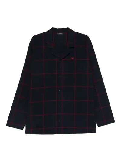 navy blue cotton blend check pattern logo detail front button fastening long sleeves notched collar