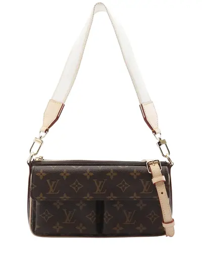 monogram canvas body with vachetta leather trim adjustable vachetta leather and canvas shoulder straps top zip closure exterior flap pockets and back slip pocket interior slip pocket brown Inclusions: dust bag, shoulder strap. Condition: EXCELLENT. This previously owned item is in near-perfect condition with no signs of damage or use. Due to the exclusivity of this item and its limited availability, processing and delivery might take longer than usual. Please refer to the photos on this product page for a detailed view of the item, including any damages declared.