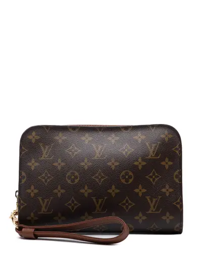 monogram canvas body detachable leather wrist strap zip around closure exterior slip pocket interior slip pocket brown Serial Number: AR1023 Inclusions: dust bag. Condition: GOOD. This previously owned and used item is in good condition with minimal signs of use. This may include fading of material or plating and scratches. Please refer to the photos on this product page for a detailed view of the item, including any damages declared.