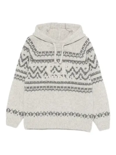 light grey patterned drawstring hood long sleeves knitted construction