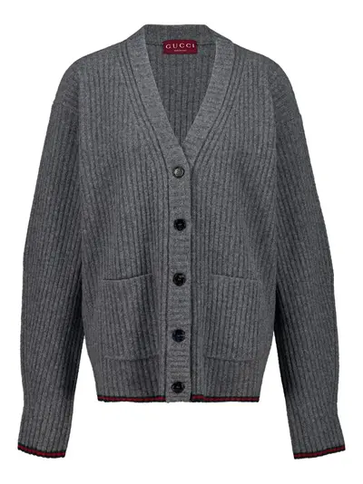 dusty dark grey ribbed knit V-neck button fastening two front pockets long sleeves wool