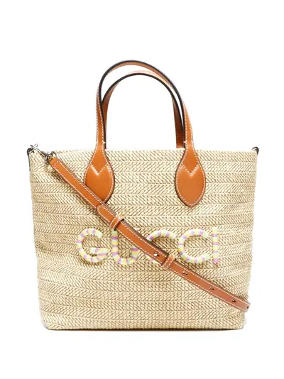 2020-2025s beige raffia top handles detachable shoulder strap logo detail internal slip pocket Condition: GOOD. This previously owned and used item is in good condition with minimal signs of use. This may include fading of material or plating and scratches.
