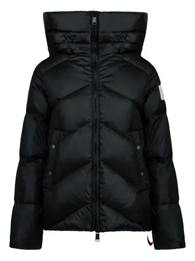 black padded design quilted finish adjustable hood front zip fastening two side press-stud pockets long sleeves logo patch