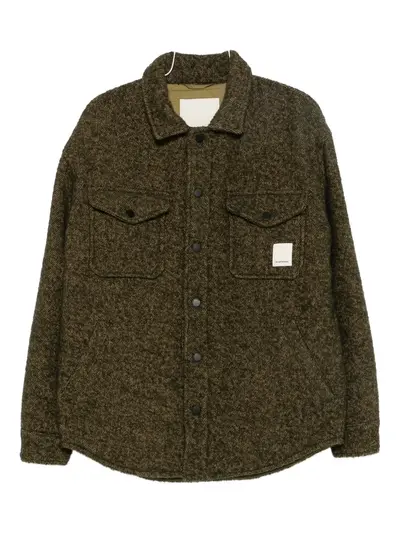 olive green spread collar press-stud fastening two chest flap pockets long sleeves curved hem