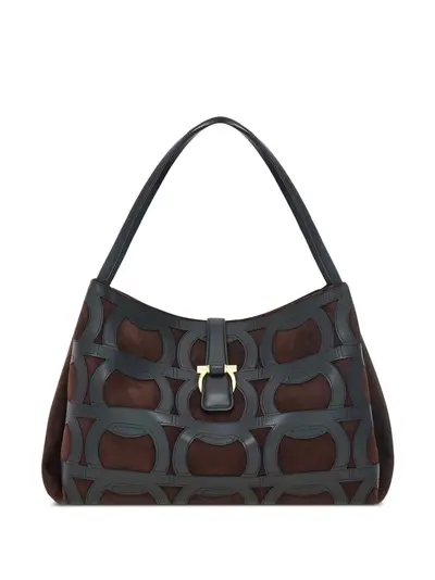 dark brown suede texture leather Gancini overlays Gancini buckle double compartment zip pocket