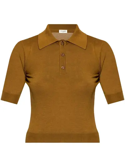 brown wool-cashmere blend fine knit polo collar front button placket short sleeves ribbed edge straight hem