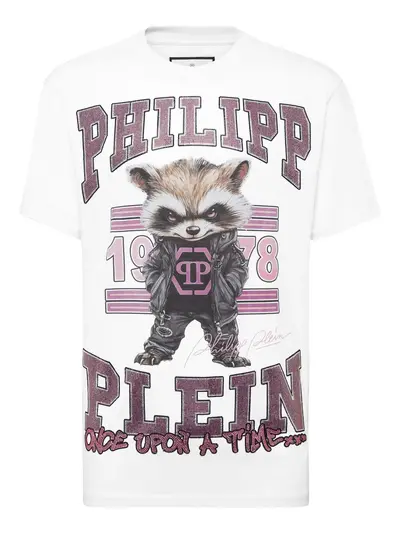 white raccoon graphic rhinestone embellishments crew neck short sleeves '1978' print 'once upon a time'-print