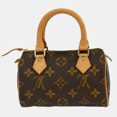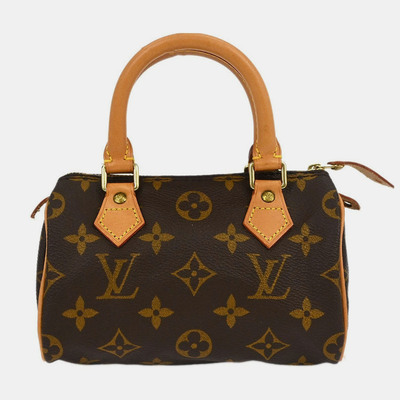 Louis Vuitton Mini Speedy bag crafted in classic Monogram canvas with natural cowhide trim and gold hardware. A compact version of the Speedy, easy to carry by hand.