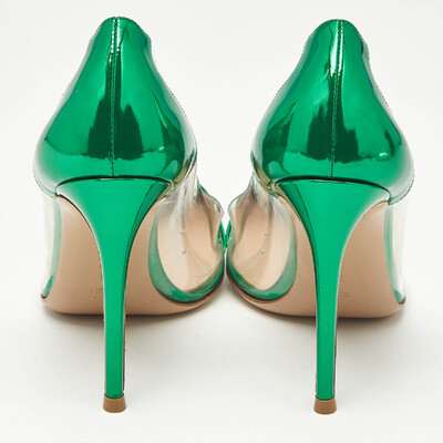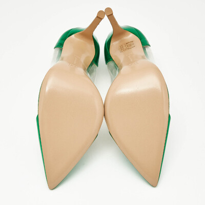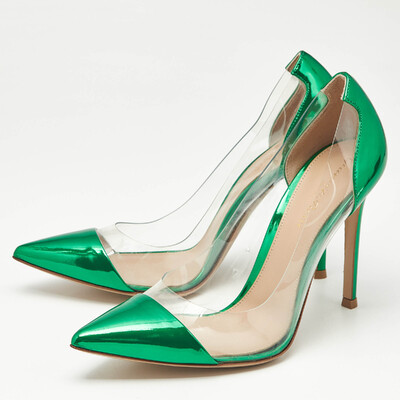Contemporary elegance defines these Gianvito Rossi pumps. The transparent PVC sides create an illusion of lightness, offset by striking green metallic leather trims. Their pointed toe profile and stiletto heel make them a perfect modern accent to minimalist ensembles, exuding sophistication with every step.