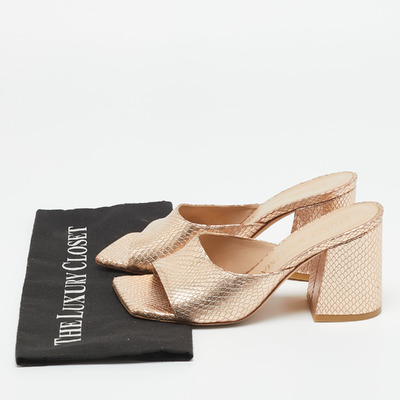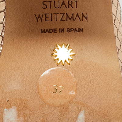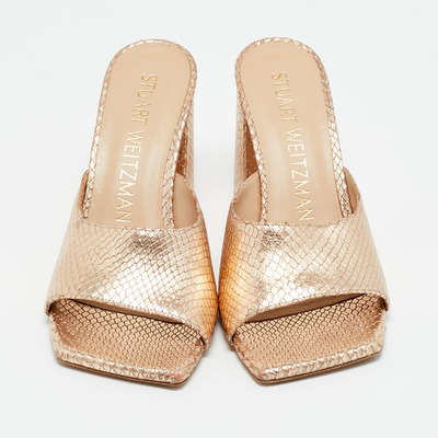 Glamorous and versatile, these Stuart Weitzman slide sandals feature gold snakeskin embossed leather for a textured shine. Their sleek silhouette and low profile offer comfort without sacrificing style. Ideal for adding a luxe touch to day or evening outfits.