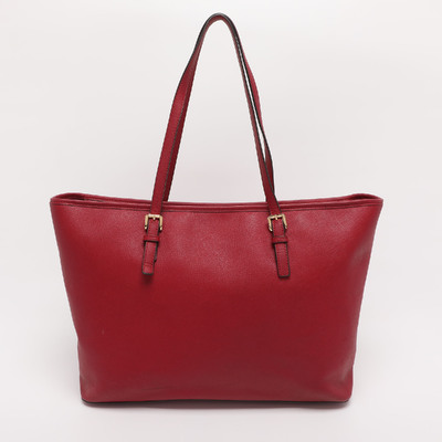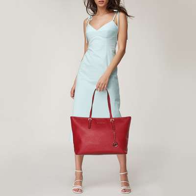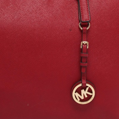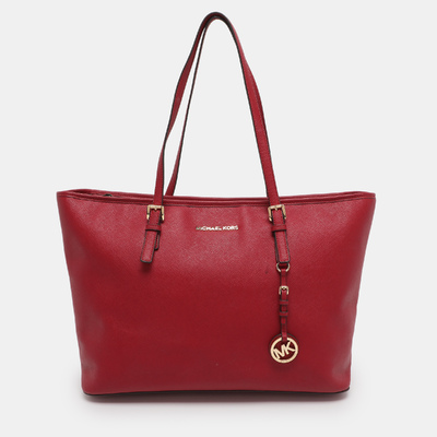 Designed for days that don’t stop, this Michael Kors Jet Set tote in red Saffiano leather keeps everything in place with effortless style. The spacious interior fits your laptop, wallet, and more, while the gold tone charm adds a shiny identification mark.
