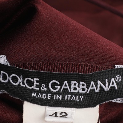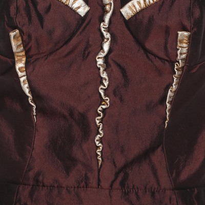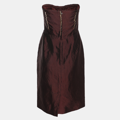 This preloved Dolce and Gabbana dress blends satin in rich burgundy with metallic leather details that stand out beautifully. Its midi length and strapless cut make it a grand pick for weddings and evenings.