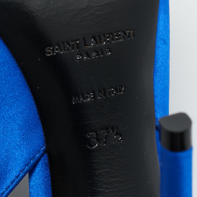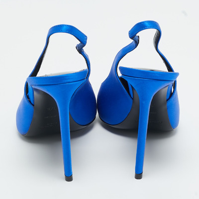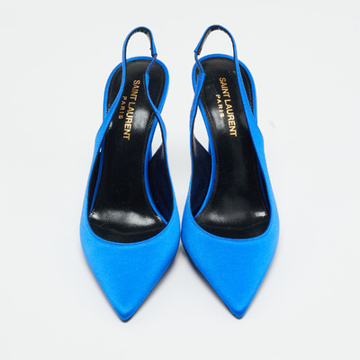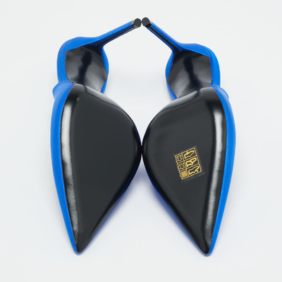 Saint Laurent’s Zoe pumps exude sleek sophistication through their lustrous blue satin finish. Designed with sharp pointed toes and slender slingback straps, they capture the brand’s minimalist sensuality. Set on stiletto heels, they’re the perfect punctuation for tailored trousers or chic cocktail silhouettes.
