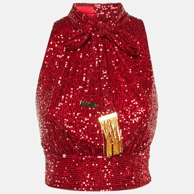 Elisabetta Franchi Red Sequin Halter Neck Scarf Detail Crop Top M 1228277 - 1