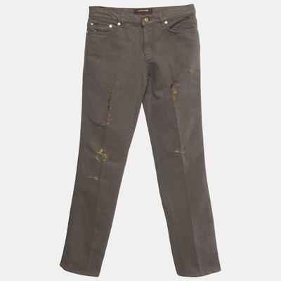 Add a touch of glamour to casualwear with these Roberto Cavalli straight leg jeans in brown and gold denim. Featuring distressed accents and metallic detailing, they reflect the brand’s edgy luxe aesthetic. A standout choice for fashion forward wardrobes.