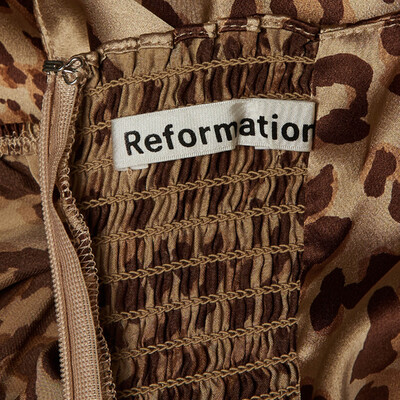 Turn heads in this Reformation silk midi dress showcasing a bold brown animal print and side slit. Designed with a flattering silhouette and sustainable craftsmanship, it exudes modern femininity. Perfect for date nights or stylish brunches.