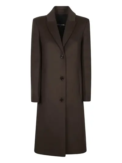 chocolate brown front button fastening peak lapels long sleeves side welt pockets straight hem