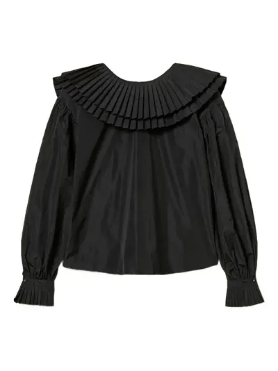 black taffeta fabric pleated flounces long sleeves button fastening tie detail