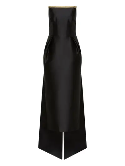 black strapless gold-tone trim side slip pockets rear zip fastening train detail