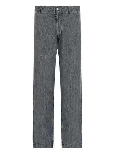 grey button fly closure belt loops two side inset pockets two rear patch pockets linen