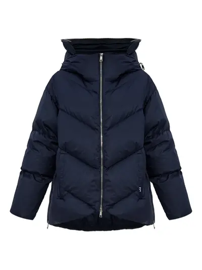 dark blue chevron quilting zip fastening hood long sleeves side pockets