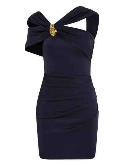 navy blue draped detailing gold-tone embellishment asymmetric neckline sleeveless ruched detailing