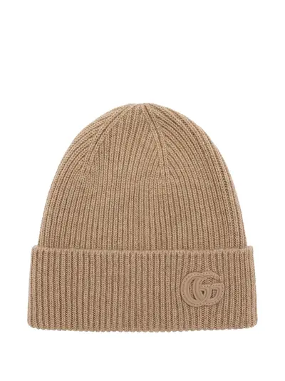 camel cashmere ribbed knit double g leather patch cuffed brim
