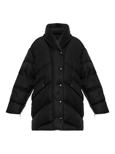 black puffer design button fastening high neck side pockets zip detail at the cuffs