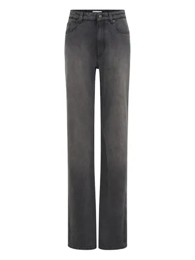dark grey high-waist five pockets belt loops flared leg top button closure