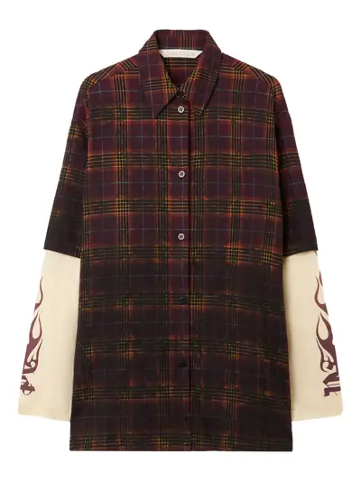 burgundy check pattern flame print sleeves classic collar button-up front logo patch