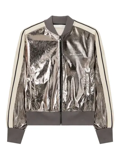 silver-tone laminated finish logo detail ribbed cuffs and hem zip fastening