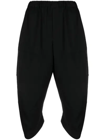 black wool elasticated waistband two side slit pockets rear flap pocket drop crotch tapered leg cropped leg straight hem
