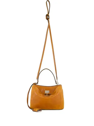 light brown top handle silver-tone hardware leather tag drawstring fastening topstitch detailing