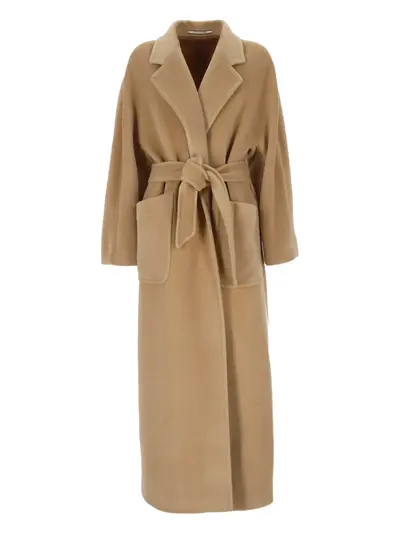 beige virgin wool-cashmere blend notched lapels detachable belt front patch pockets long sleeves