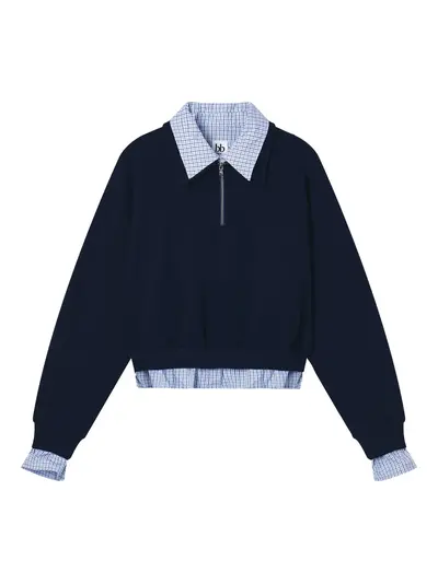 navy blue check pattern zip fastening collared long sleeves elasticated hem