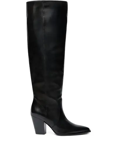 black knee-high 75mm block heel pointed toe structured shaft zip fastening