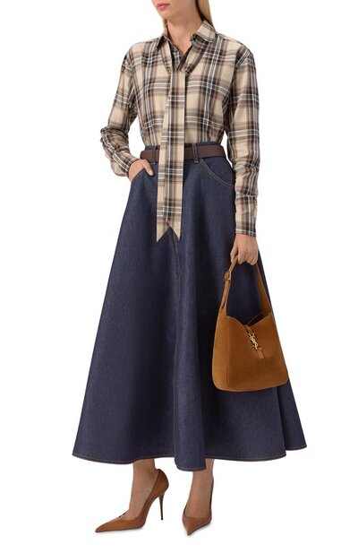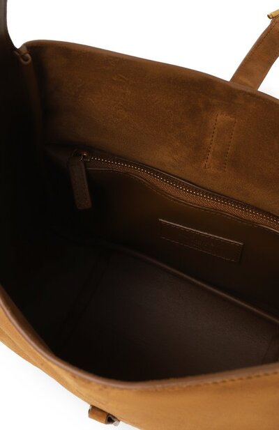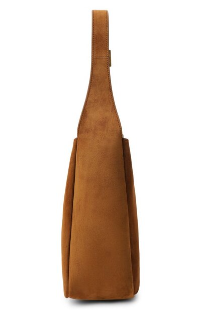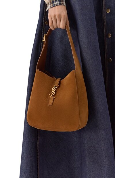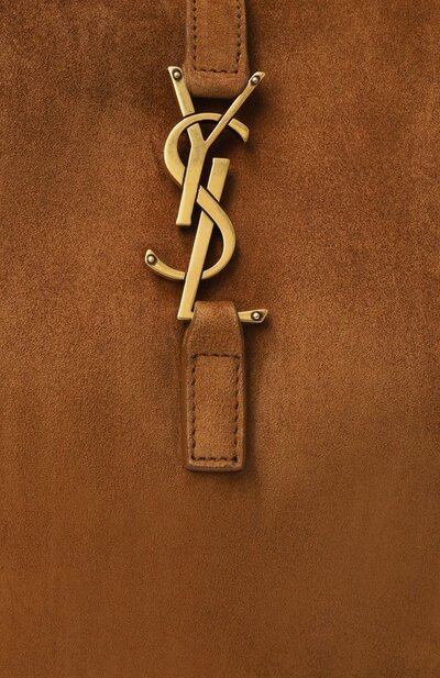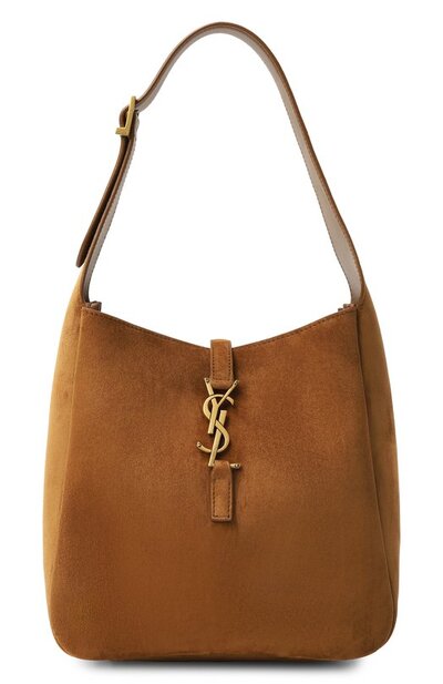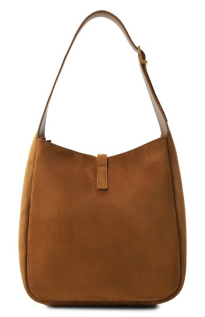 Сумка Le 5 a 7 из замши оттенка Caramel Cognac застегивается крючком в виде монограммы Кассандра. Внутри аксессуар с регулируемой ручкой дополнили карманом на молнии.