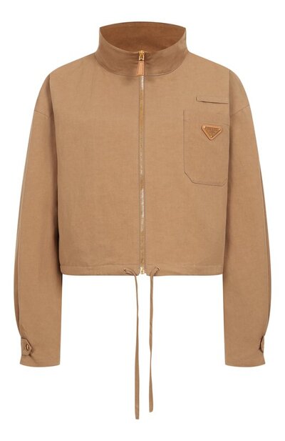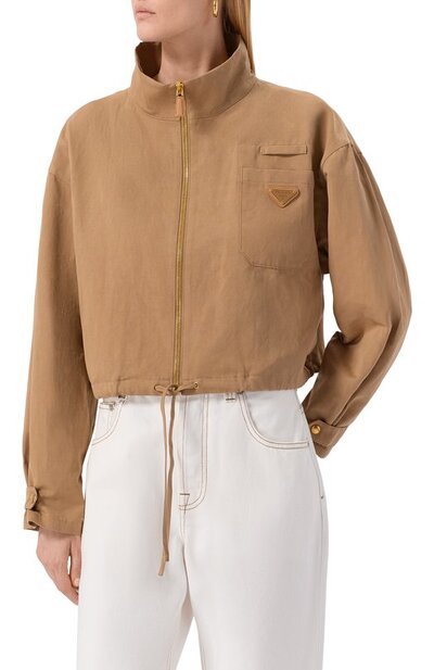 Для пошива укороченной куртки на молнии использовали ткань из хлопка и льна. Модель с воротником-стойкой и кулиской внизу дополнена патами на манжетах и нагрудным карманом с фирменным эмалевым треугольником.