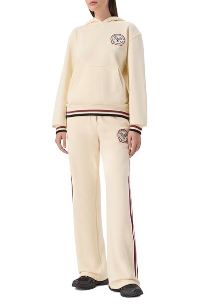 Худи из хлопкового трикотажа с добавлением полиэстера станет основой комфортного образа. Модель с карманом «кенгуру» украсили брендированным патчем Country club, оттенкам которого вторят полоски на эластичных манжетах и поясе.
