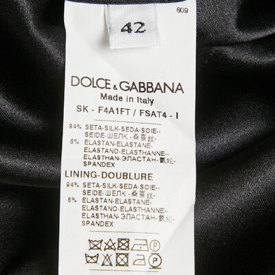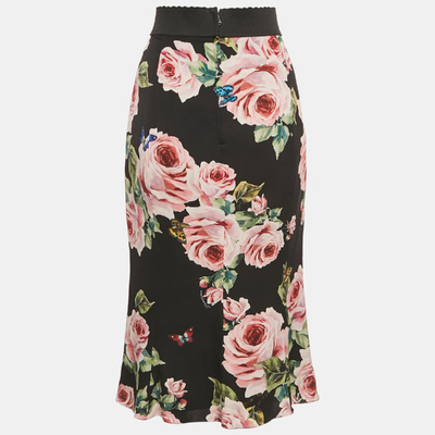 Crafted from smooth silk, this preloved Dolce and Gabbana skirt features pink rose prints against a deep black base. The fitted silhouette and mid length cut create a graceful shape that’s both classic and statement making. Perfect for pairing with a crisp blouse or a simple knit.