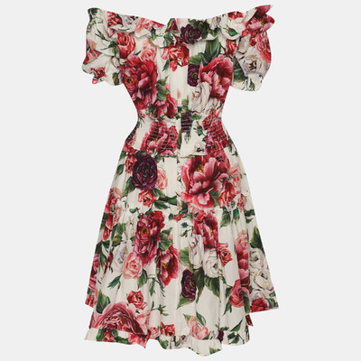 Vibrant and full of movement, this Dolce and Gabbana cotton dress has an off shoulder cut and blooming flowers all over. The ruffled trims and smocked waist give it a shapely finish.