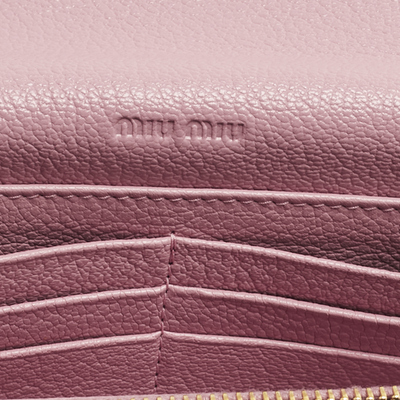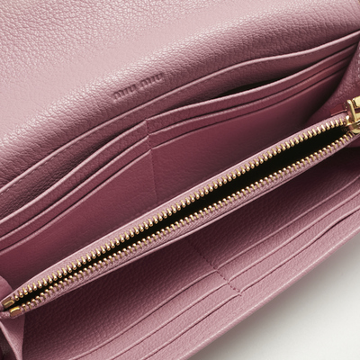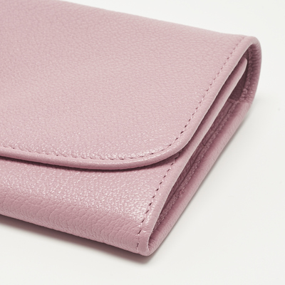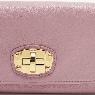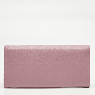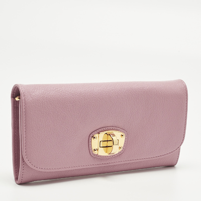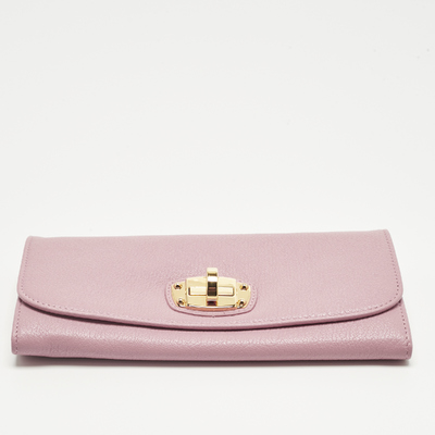 Elegant and feminine, this Miu Miu continental wallet in pink leather features a sleek twist lock flap. Its organized interior and polished finish make it a perfect blend of practicality and luxury.