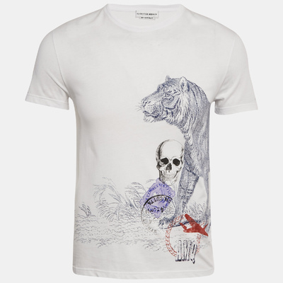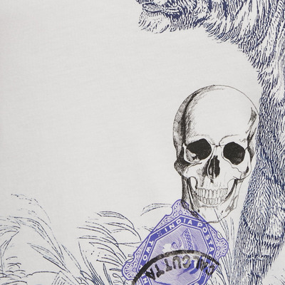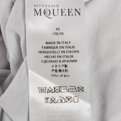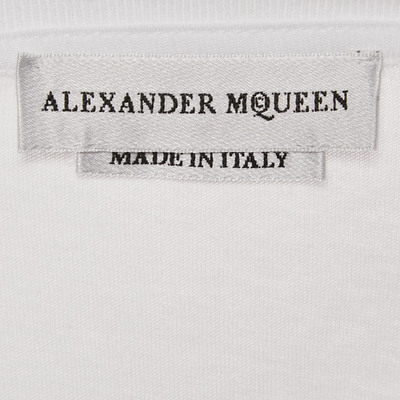 Infused with McQueen’s signature dark romanticism, this white jersey T shirt showcases the iconic skull motif in a sleek print. Crafted for comfort with a minimalist cut, it adds a rebellious edge to casual styling. Ideal for modern wardrobes with an avant garde twist.