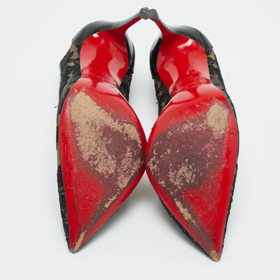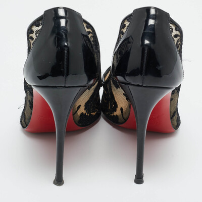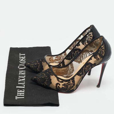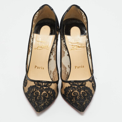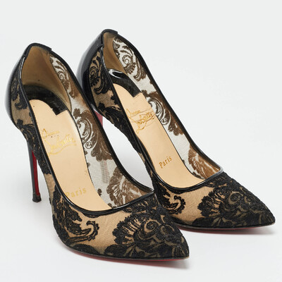 Dazzle everyone with these Louboutins by owning them today. Crafted from patent leather and lace, these black pumps carry a mesmerizing shape with pointed toes and 10cm heels. Complete with the signature red soles, this pair truly embodies the fine art of shoemaking. A classic pair that will elevate every outfit, they are a must have.