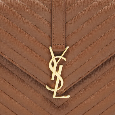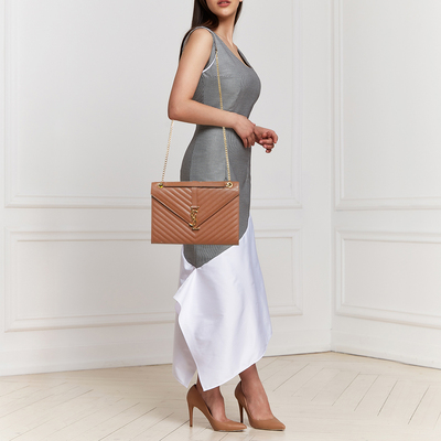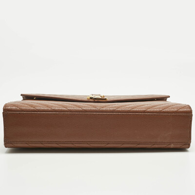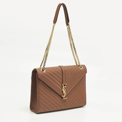 Saint Laurent’s signature Parisian glamour shines through this Envelope shoulder bag. Designed in supple brown chevron quilted leather, it is adorned with the iconic YSL monogram in polished hardware. Its structured form, versatile chain strap, and spacious interior make it an effortless choice for both day to night styling.