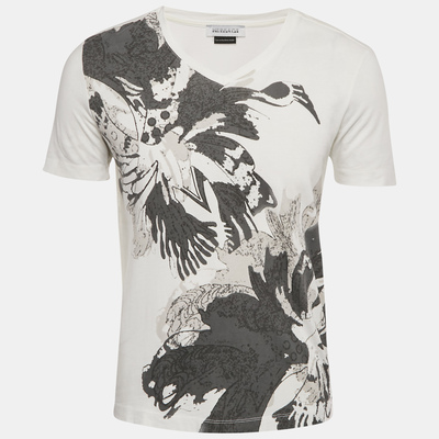 Crafted from soft white jersey, this Versace T shirt showcases a vibrant graphic print that captures the brand’s bold aesthetic. The V neckline adds a modern touch to its relaxed silhouette. Perfect for elevating everyday looks with a hint of Italian luxury.
