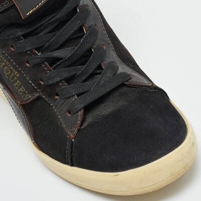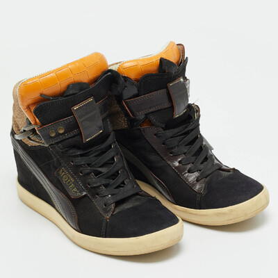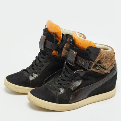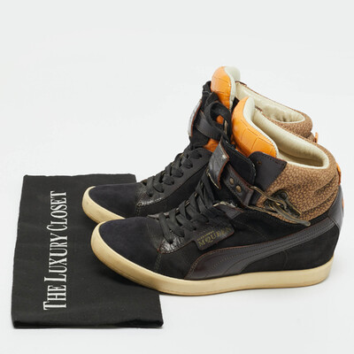 Bold and sculptural, these Alexander McQueen wedge sneakers are crafted from multicolor croc embossed leather and suede. The exaggerated sole adds height and impact, while the mix of textures enhances their avant garde appeal. Perfect for fashion forward street style.
