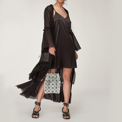 Issey Miyake’s Bao Bao Wring bag transforms geometry into art. Crafted from mesh and glossy PVC triangles, its flexible form shifts fluidly with movement. The monochrome palette accentuates its architectural brilliance, while the drawstring top secures essentials in sculptural style. Light yet durable, it captures the label’s futuristic DNA — a perfect companion for modern dressing that blends innovation with wearable design.