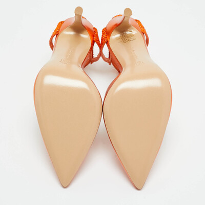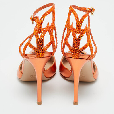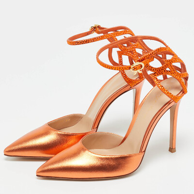 Radiant and refined, Gianvito Rossi’s Fleur sandals are sculpted from metallic orange leather that glows under light. The minimalist design is defined by curved straps and a refined stiletto heel, balancing architectural structure with fluid femininity. Expertly crafted in Italy, they exemplify the label’s devotion to proportion and comfort. Pair them with evening dresses or cropped tailoring for a statement of pure modern glamour.